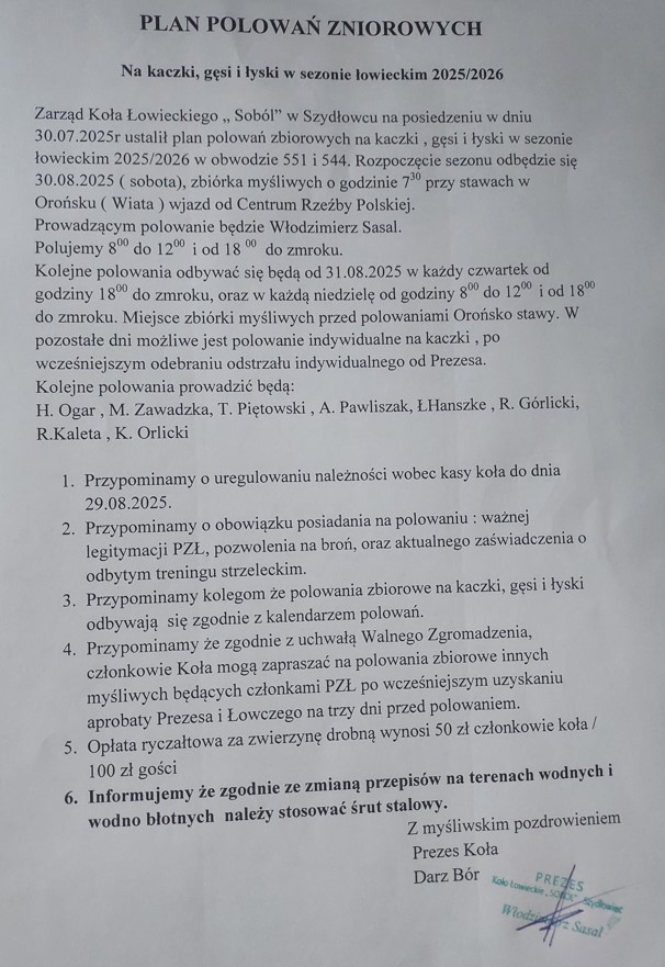 Treść zakładkiPlan polowań zbiorowych na kaczki, gęsi i łyski w sezonie łowieckim 2025/2026 Koła Łowieckiego "Soból" w Szydłowcu